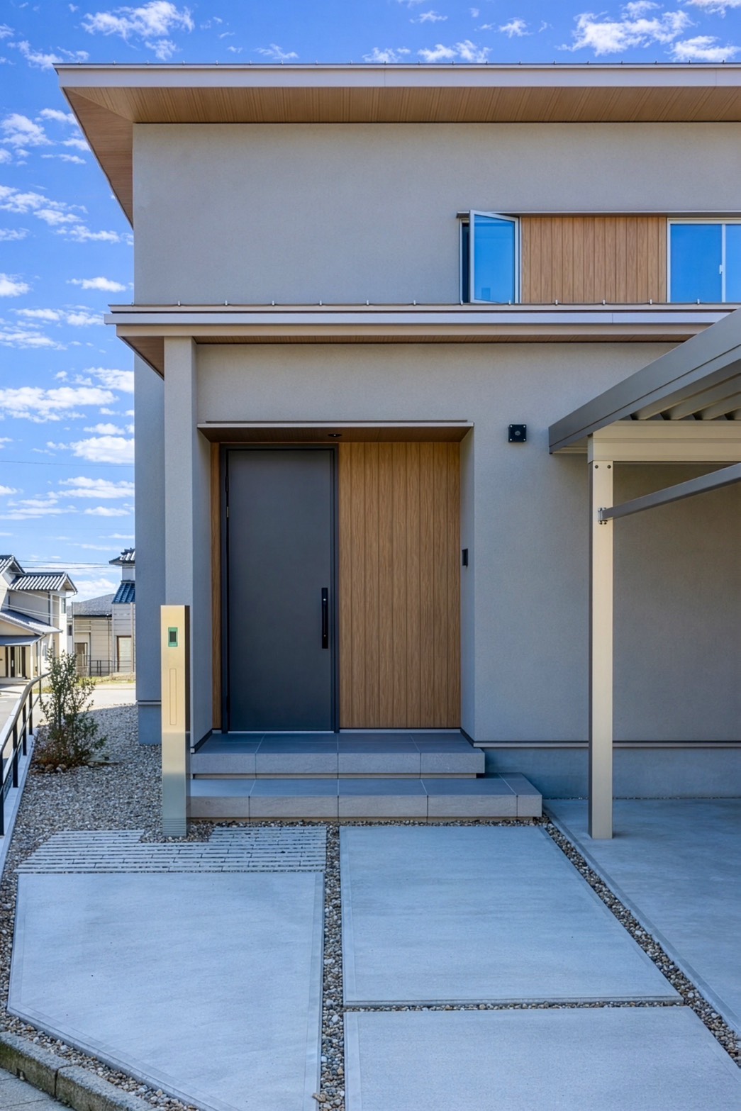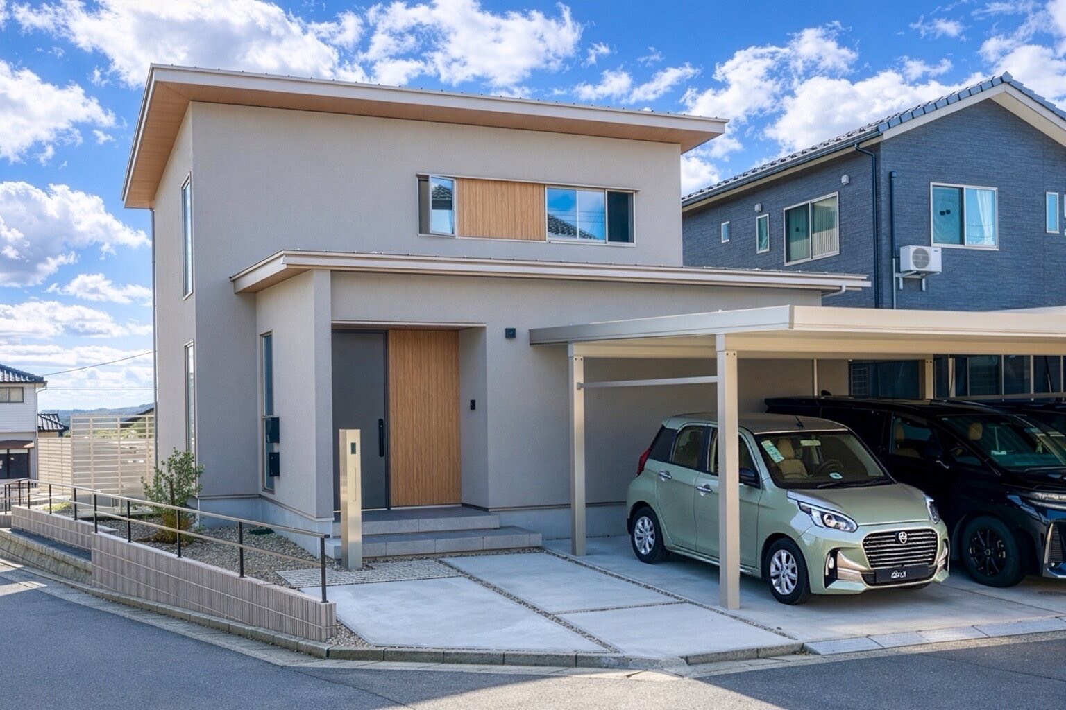 やわらかな塗り壁の外観に、木のアクセントが映えるシンプルで上質なデザイン。